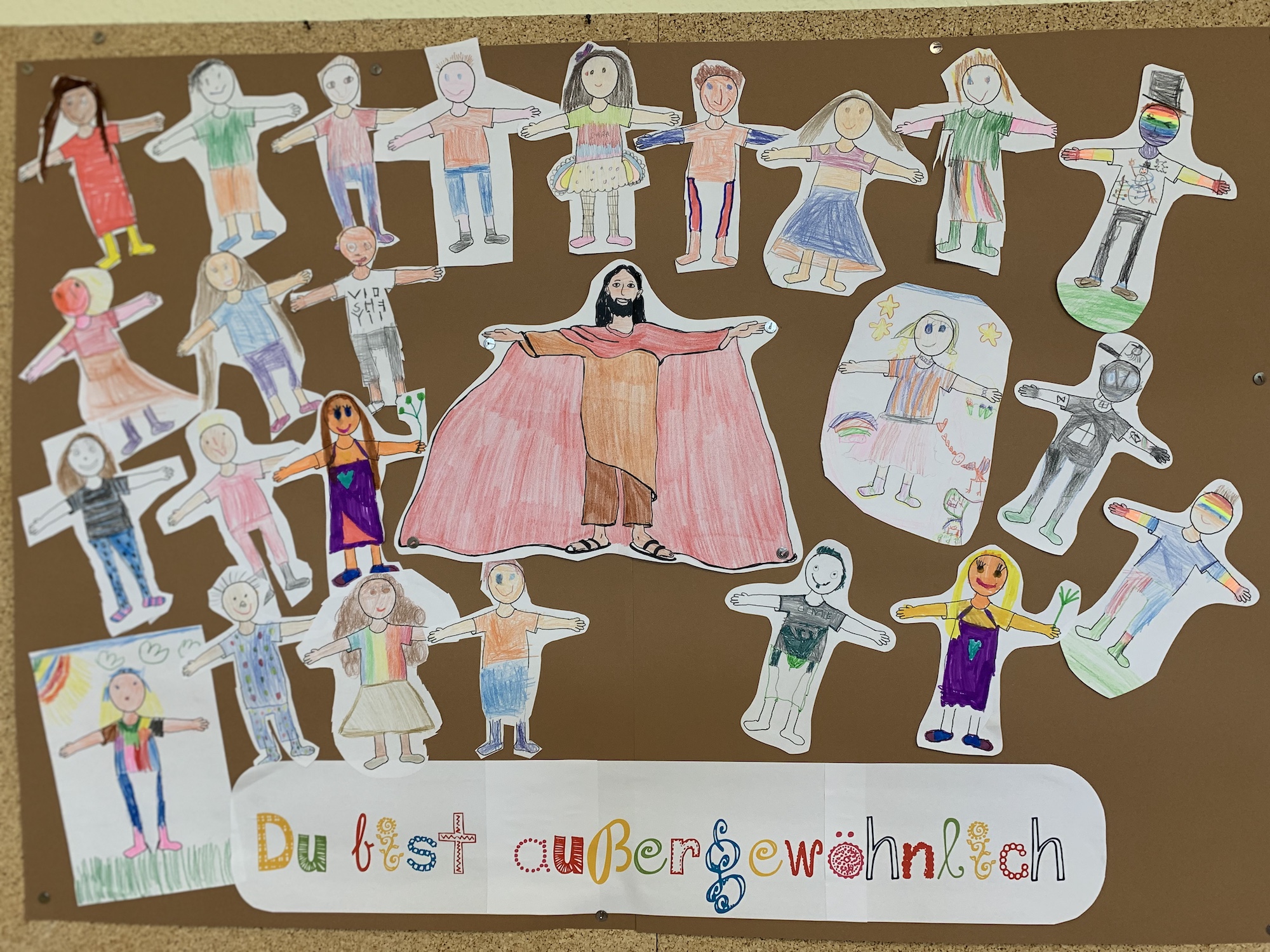 Dazu gestalteten die Schulanfänger im Religionsunterricht ein Gemeinschaftsplakat. Jeder ist wichtig und einzigartig. Ganz im Sinne von „gemeinsam sind wir stark“.