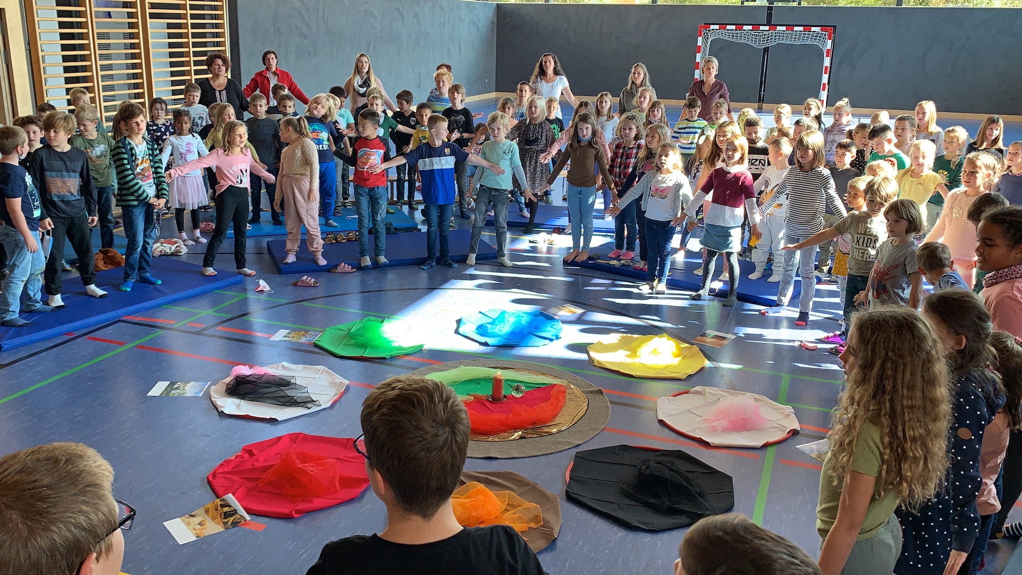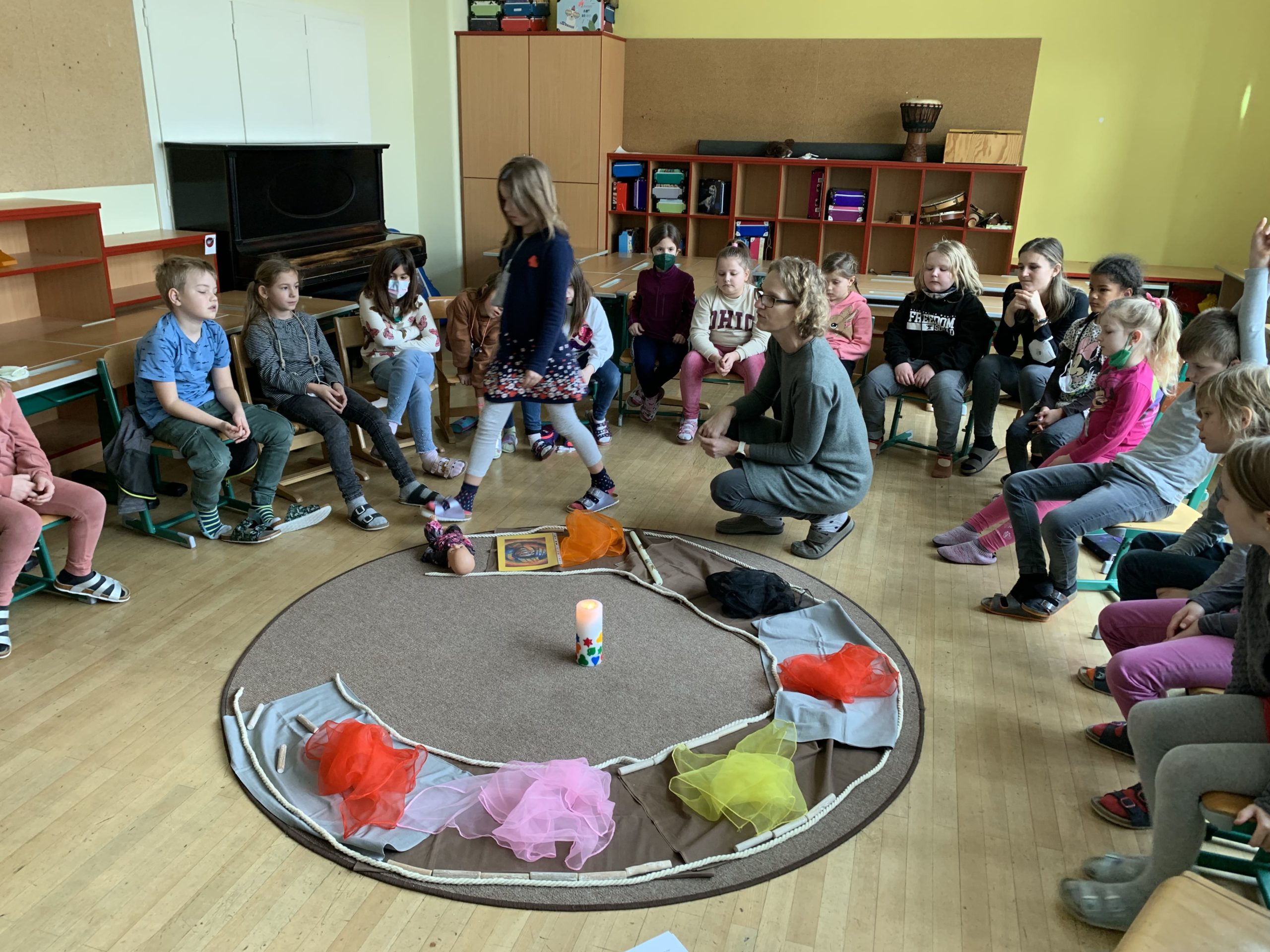 Die Erstklässler tanzen mit Tüchern und entdeckten die Sonne als Symbol der Auferstehung.