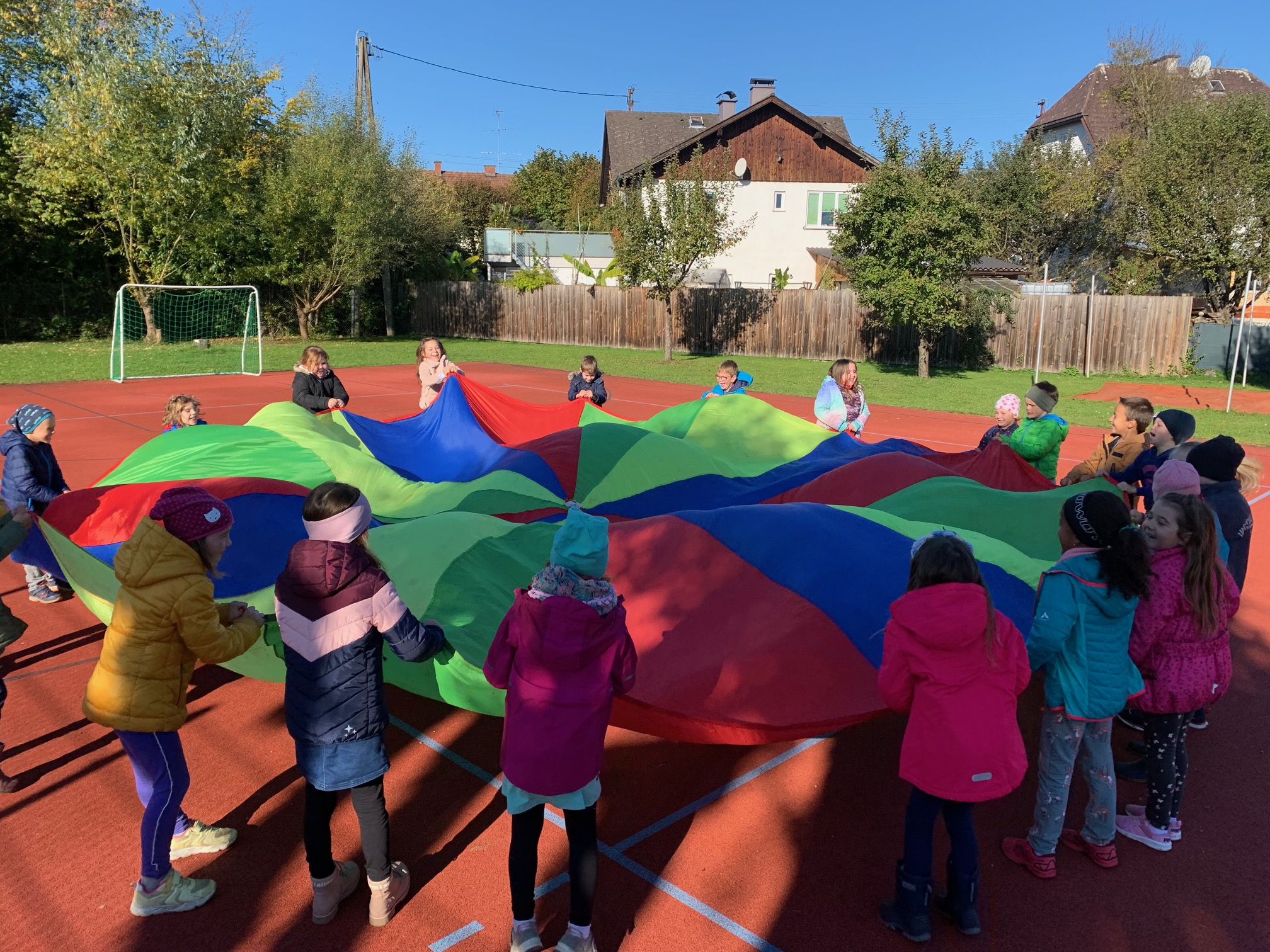 Ich bin da, das ist wahr, das ist wunderbar. Gott ist da, das ist wahr, das ist wunderbar. Dieses Lied konnte man von den Schulanfängern am Sportplatz hören. Anhand dieses wunderschönen bunten Schwungtuches konnten sich die Kinder Gottes behütetes Zelt vorstellen. Das war ein Spaß.