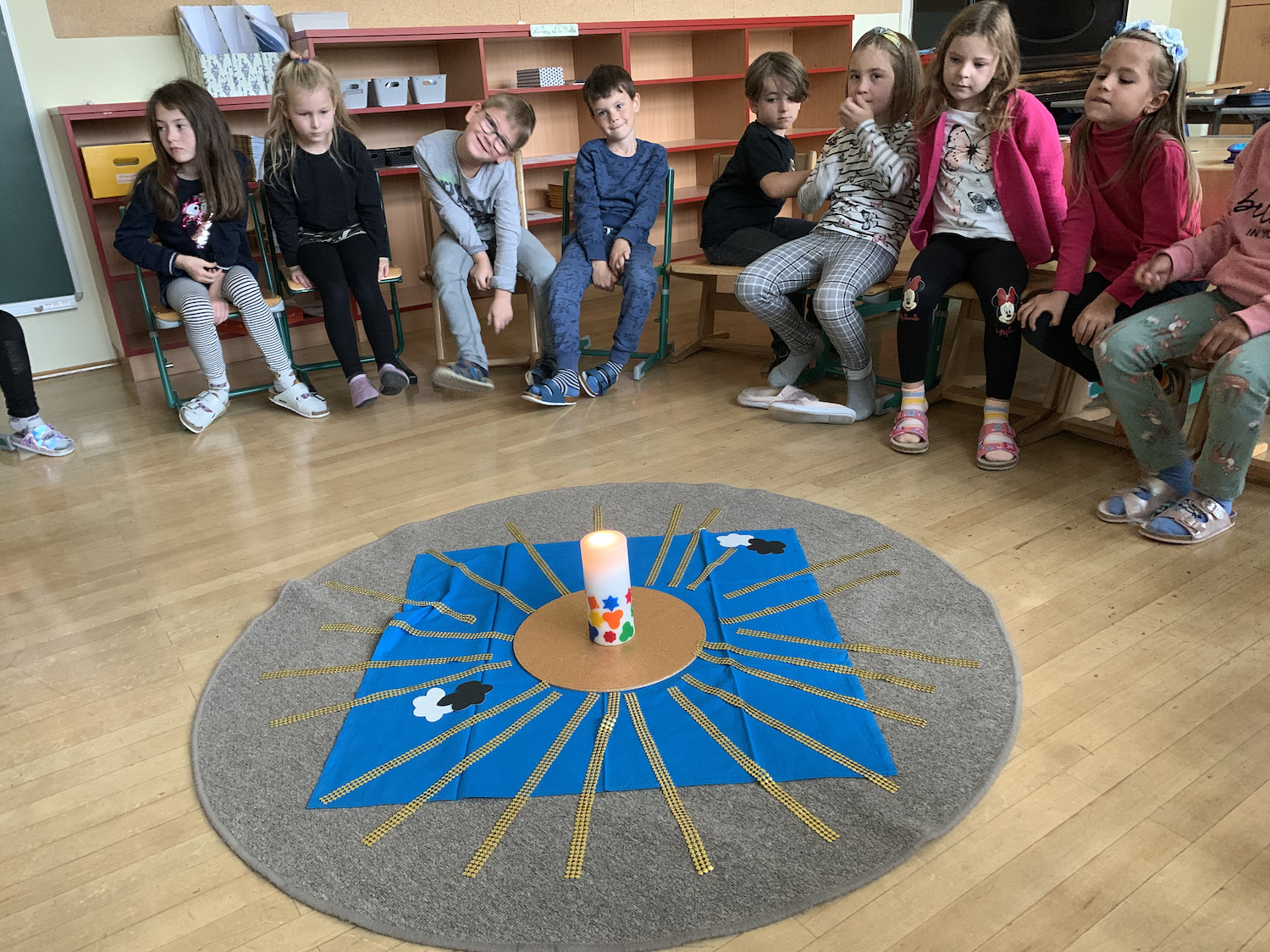 Die Kinder aus der Grundstufe 1 befassten sich mit Gottes Schöpfung. Als Zentrum stand erst einmal die Weltkugel, welche sich dann in das Zeichen des Lichtes verwandelte. Staunend wurden die wunderbaren Dinge entdeckt, welche Gott uns geschenkt hat. Gemeinsam ist ein wunderschönes Bild entstanden. Wir sind für alles DANKBAR was wir auf der wunderbaren Welt…