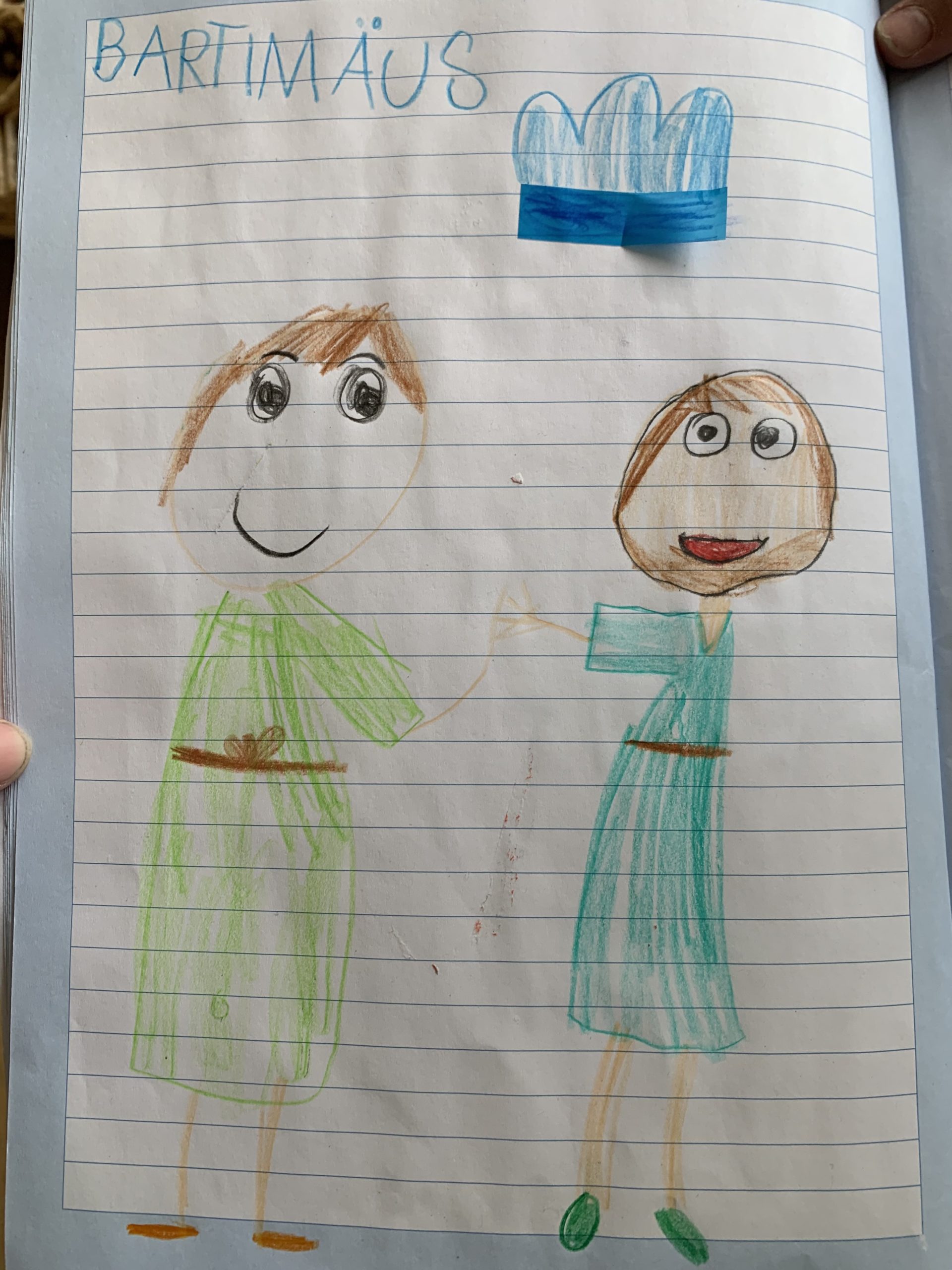 Die Kinder der ersten Klassen hörten wieder eine aufregende Jesusgeschichte vom blinden Bartimäus, welche sie dann auch zeichnerisch umsetzten.