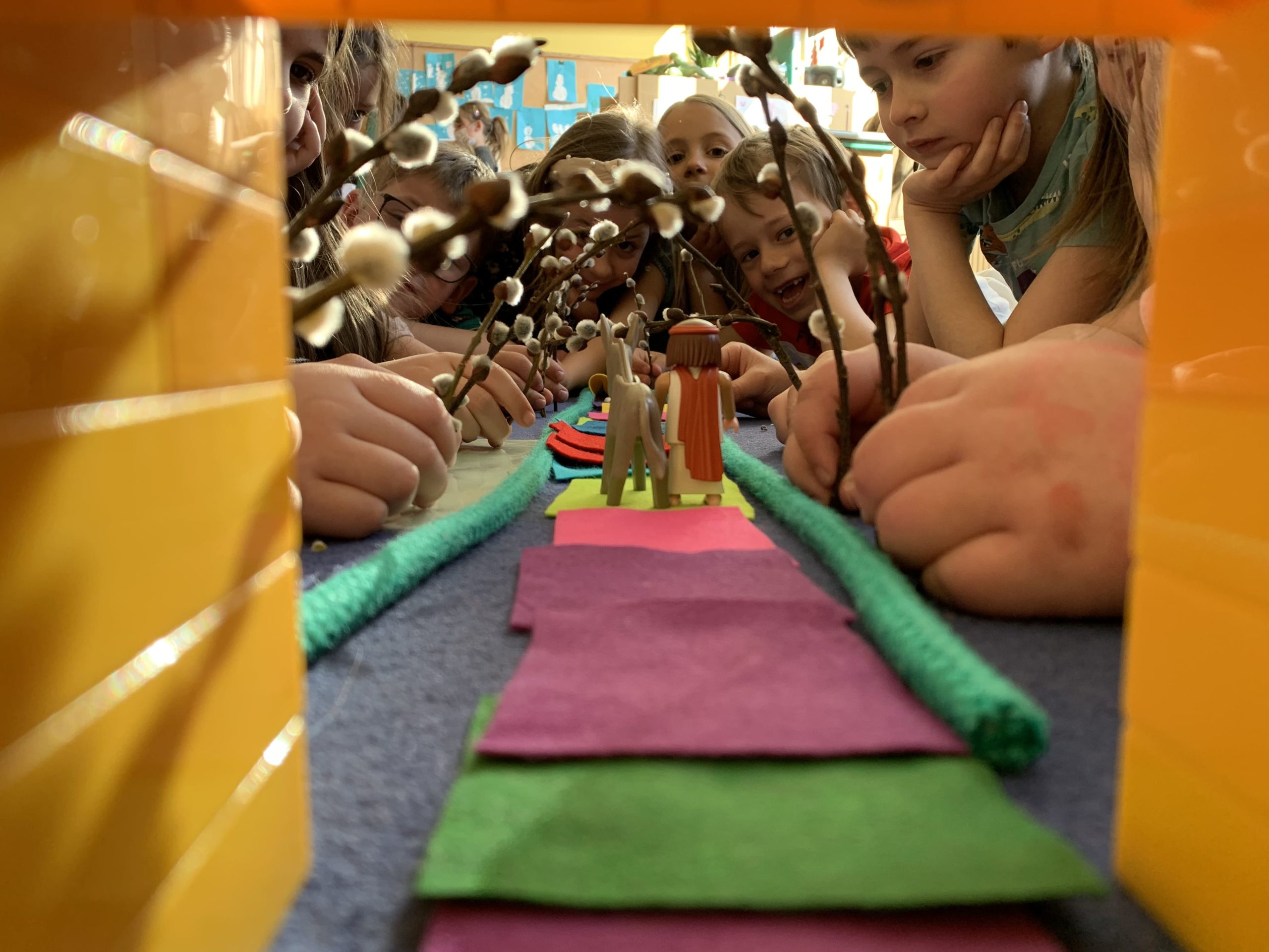 Der erste „Feiertag“, der die Karwoche einleitet. Gespannt hörten die Kinder die Geschichte vom Palmsonntag. Jeder durfte wieder die Geschichte mitgestalten und so entstand ein wundervolles Abschlussbild zu dem Thema.
