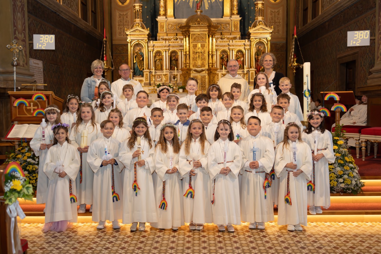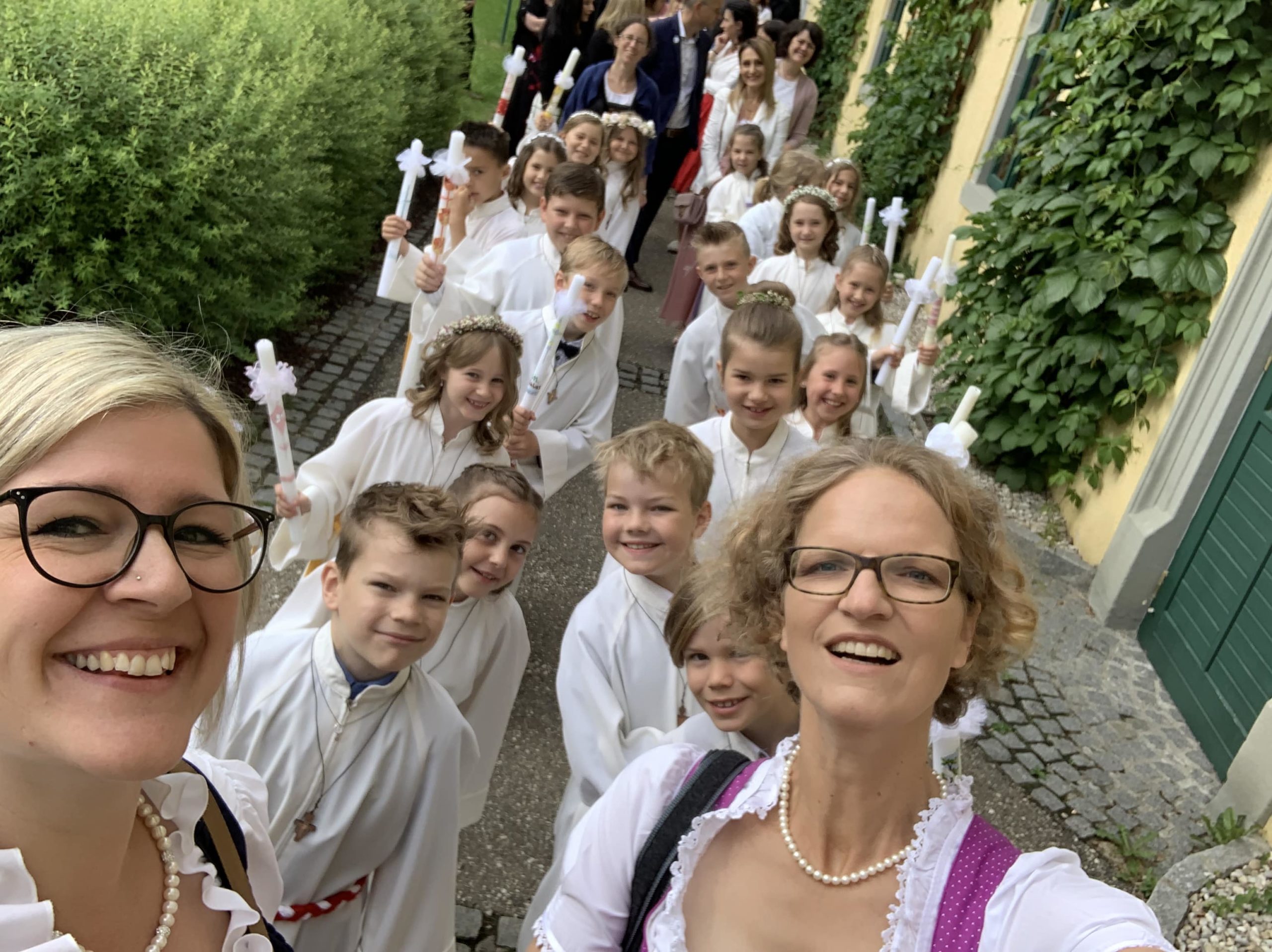 Erstkommunion am 9. Mai 2024 in der Basilika Puchheim. Segensfeier am Montag, 13.5. in der Georgskirche bevor wir zum Erstkommunionausflug aufbrachen. Ausflug zum Wald der Kinder nach Zell am Pettenfirst.