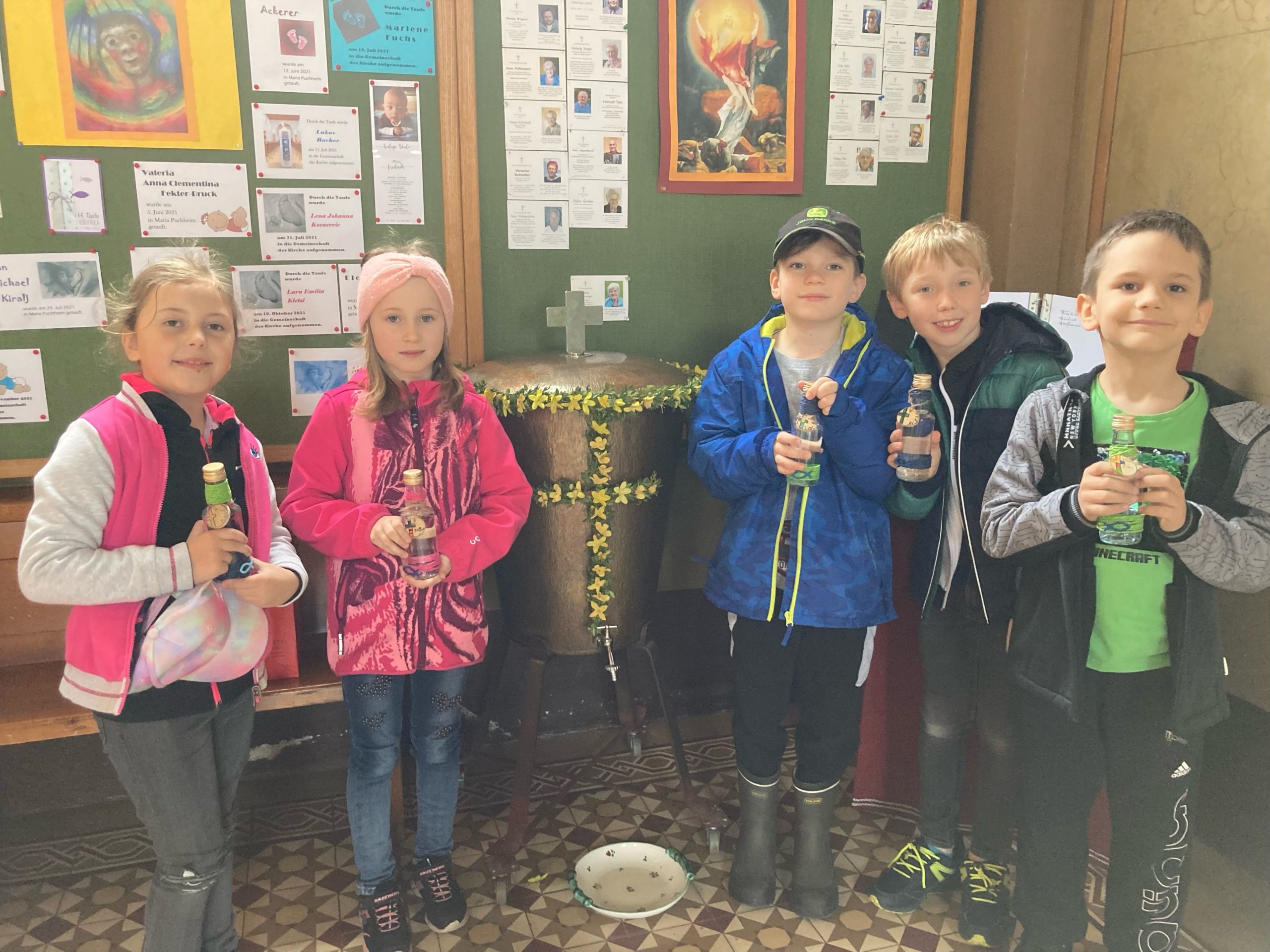 … und daran soll uns auch das Weihwasser erinnern, das die Erstkommunionkinder in ihre selbst gestalteten Fläschchen abfüllen durften. Das besondere Weihwasser aus der Osternacht haben die Kinder nun auch zuhause.