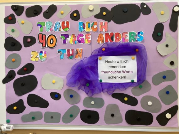 … unter diesem Motto stand in diesem Jahr die Fastenzeit. In dieser besonderen Vorbereitungszeit auf das Osterfest haben wir uns jeden Tag einen Vorsatz genommen, wie wir trainieren können, besser aufeinander Acht zu geben und friedlich miteinander umzugehen.