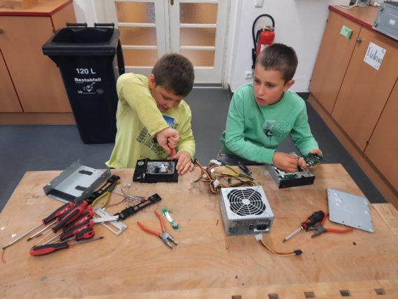 Die Eulenklasse hatte heute einen Workshop zum Thema Elektroaltgeräte. Sie haben über den Abbau verschiedener Rohstoffe, über die Gefahren von Elektroakkus und die richtige Entsorgung der einzelnen Bestandteile von Geräten erfahren. Dazu durfte jedes Kind einen alten PC zerlegen. Ein weiteres Highlight war ein anscheinend “antikes” Telefon mit Wählscheibe. 😉