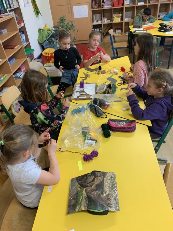 Erst war es nur eine: “Was machst du denn da Frau Lehrerin?” “Ich häkle Luftmaschen!” “Darf ich das auch?” “Na klar!” Und so entstand ein fast täglicher 10-Minuten Stamm-Häkel-Tisch!! 😉