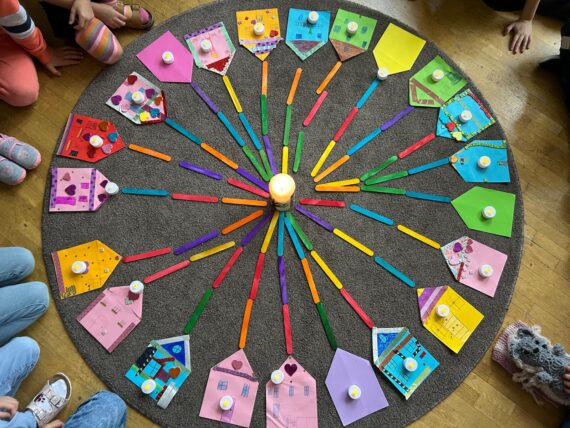 Die Erstklässler erfahren: Wir wohnen in einem Haus. Wir sind selbst ein Haus. Wir brauchen ein Zuhause. Wir schenken ein Zuhause. Licht und Wärme leuchtet aus unserem Zuhause in die Welt hinaus.